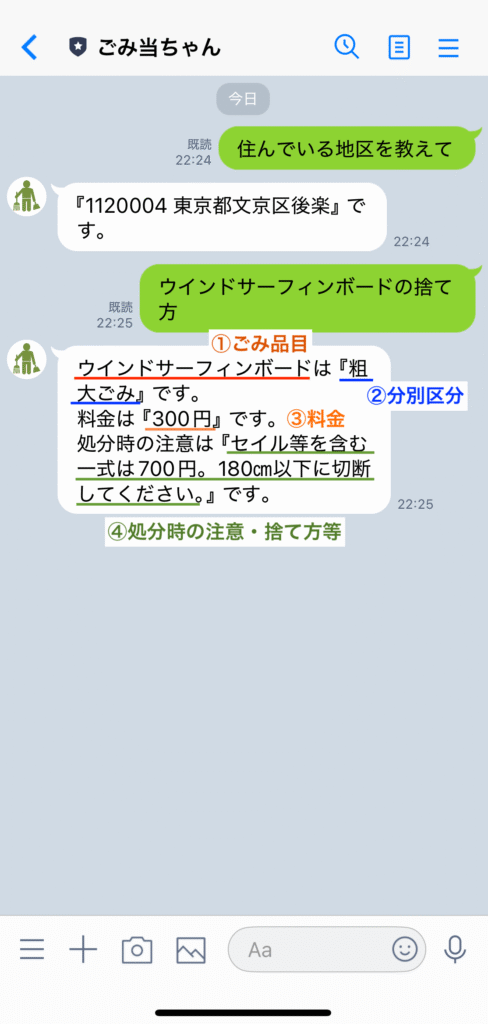 ごみ分別情報を尋ねた時に返すメッセージの以下の箇所で使用しています。
